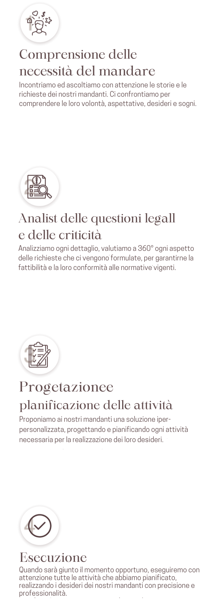 Custodiamo e portiamo a compimento volontà che non avrebbe senso scrivere in un testamento, ci interessiamo dei desideri che non si possono delegare ad un notaio o rivelare ad un parente. Il nostro compito è quello di trasformare in realtà tutto ciò che, per un motivo o per un altro, i nostri mandanti non sono riusciti, non hanno voluto o non hanno potuto realizzare in tempo.